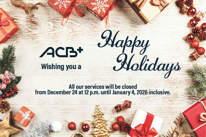 Dear Partners, The entire ACB+ team wishes you a wonderful holiday season and thanks you for your trust throughout the year. Our offices and manufactures will be closed from December 24 at 12:00 PM until January 4, 2026 inclusive. We look forward to seeing you again on January 5, 2026. See you soon, The ACB+ Team