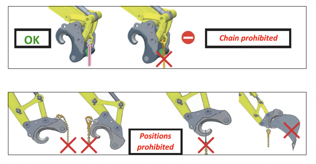 - Respect the lifting positions shown below. Depending on the coupler version, the rings may be at the front, at the rear, disabled or non-existent. And/or lifting may be by the machine crank.